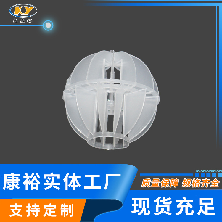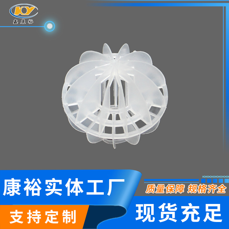 塑料多面空心球填料是水處理項目和廢氣處理常用到的一種填料,也是現在環(huán)保裝置項目常見(jiàn)的一種填料,大多采用聚丙烯(PP)塑料制成。多面空心球填料,在球中部沿整個(gè)周長(cháng)有一道加固環(huán),環(huán)的上下各有十二片球瓣,上下球瓣互相交錯,沿中心軸呈放射形布置。多面空心球填料具有表面積大,傳質(zhì)效率高,產(chǎn)品的球瓣與球瓣之間空間大,且重量輕、強度大、安裝方便、葉片多,阻力小,耐高溫,耐腐蝕,性能穩定,適用于中間水箱,二氧化碳脫氧塔,接觸反應塔等裝置。在全國電力、化學(xué)、化纖、電子、造紙、化肥生產(chǎn)、河水淡化,環(huán)保、三廢處理等行業(yè)的水處理、脫碳、脫氣、凈化、脫碳酸及油水分離等處理裝置中廣泛使用。